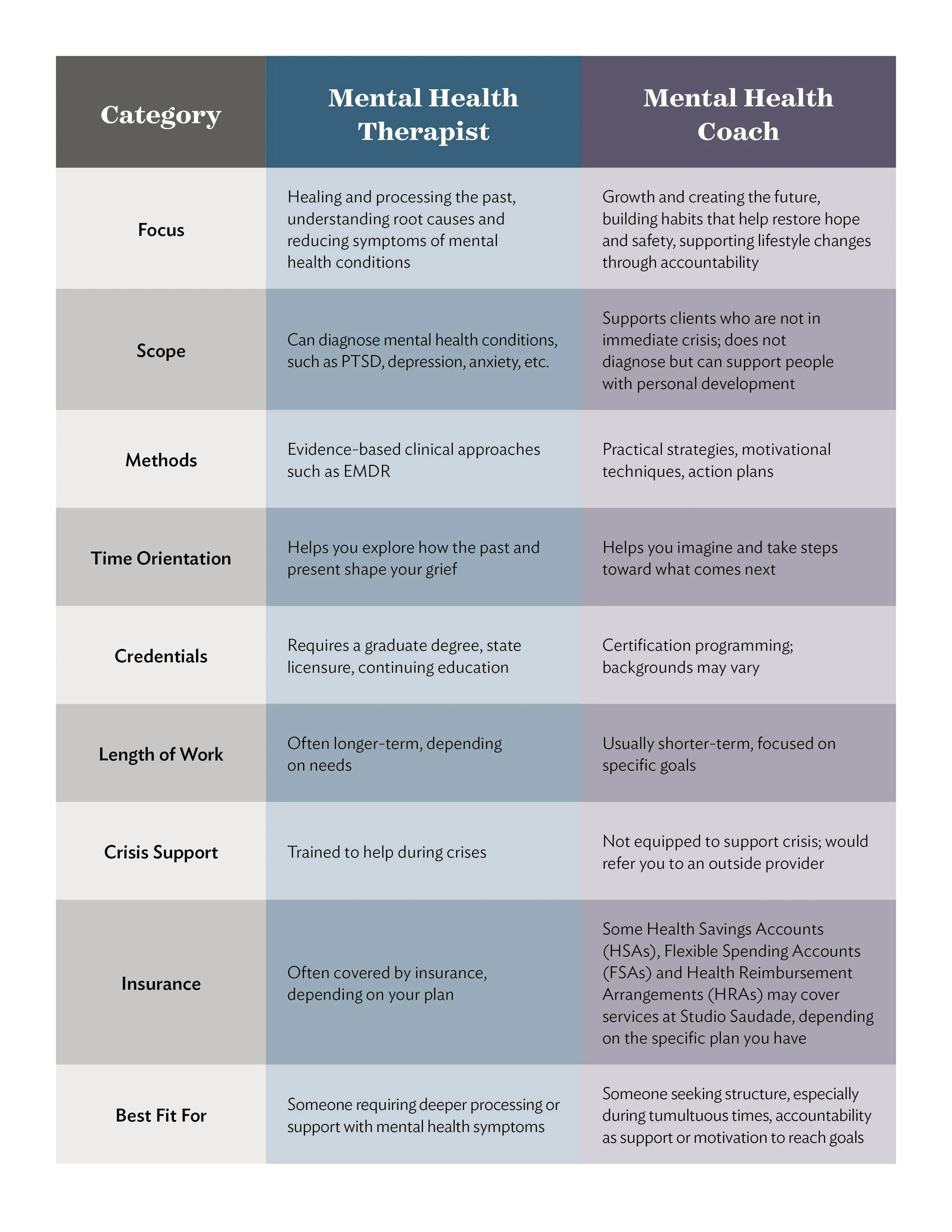By considering these qualities, you can find a therapist or coach who aligns with your needs and can support you in your healing journey. Within Studio Saudade, Certified Trauma Care Practitioners bring training specific to grief, trauma, and crisis navigation. This means clients not only receive compassionate space for their emotions but also practical guidance in creating supportive routines and connecting with other professionals as needed. Coaching here is not limited to encouragement—it is structured, embodied, and grounded in trauma-informed care.